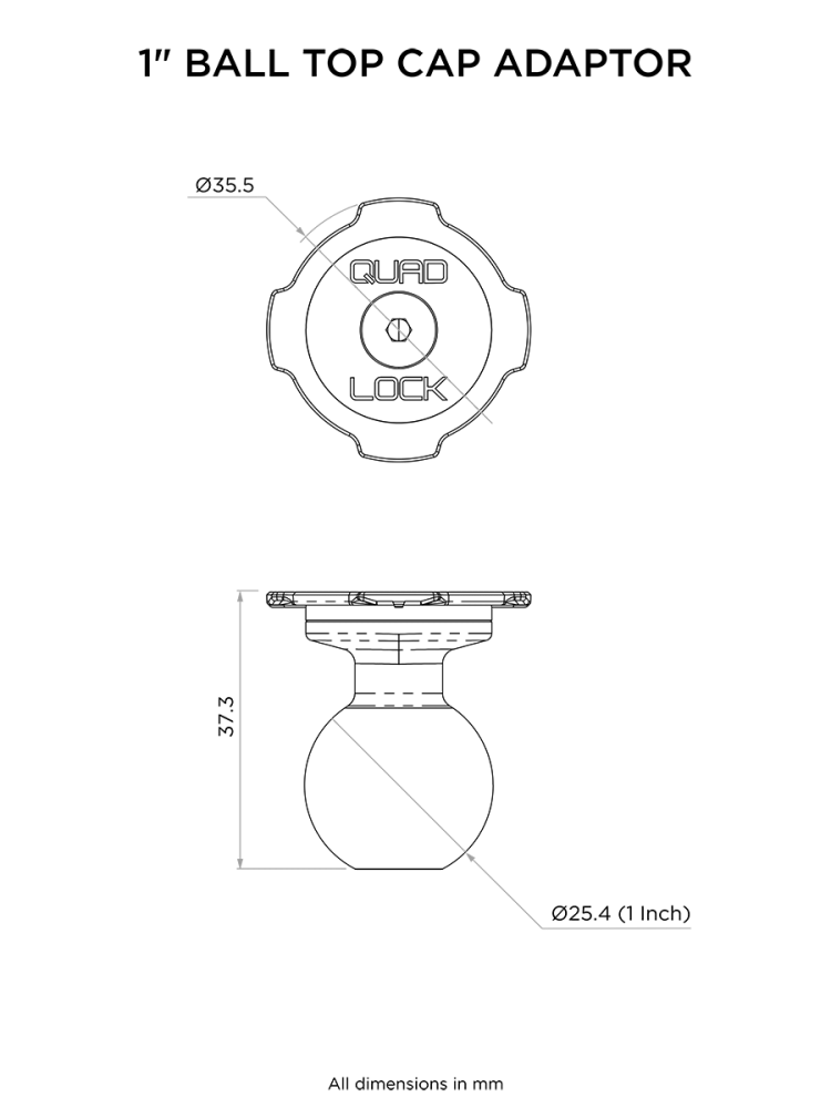 Adapter Quad Lock® Ball Top Cap jest kompatybilny ze wszystkimi ramionami 1" i mogą być używane wszędzie tam, gdzie występują ramiona 1".
