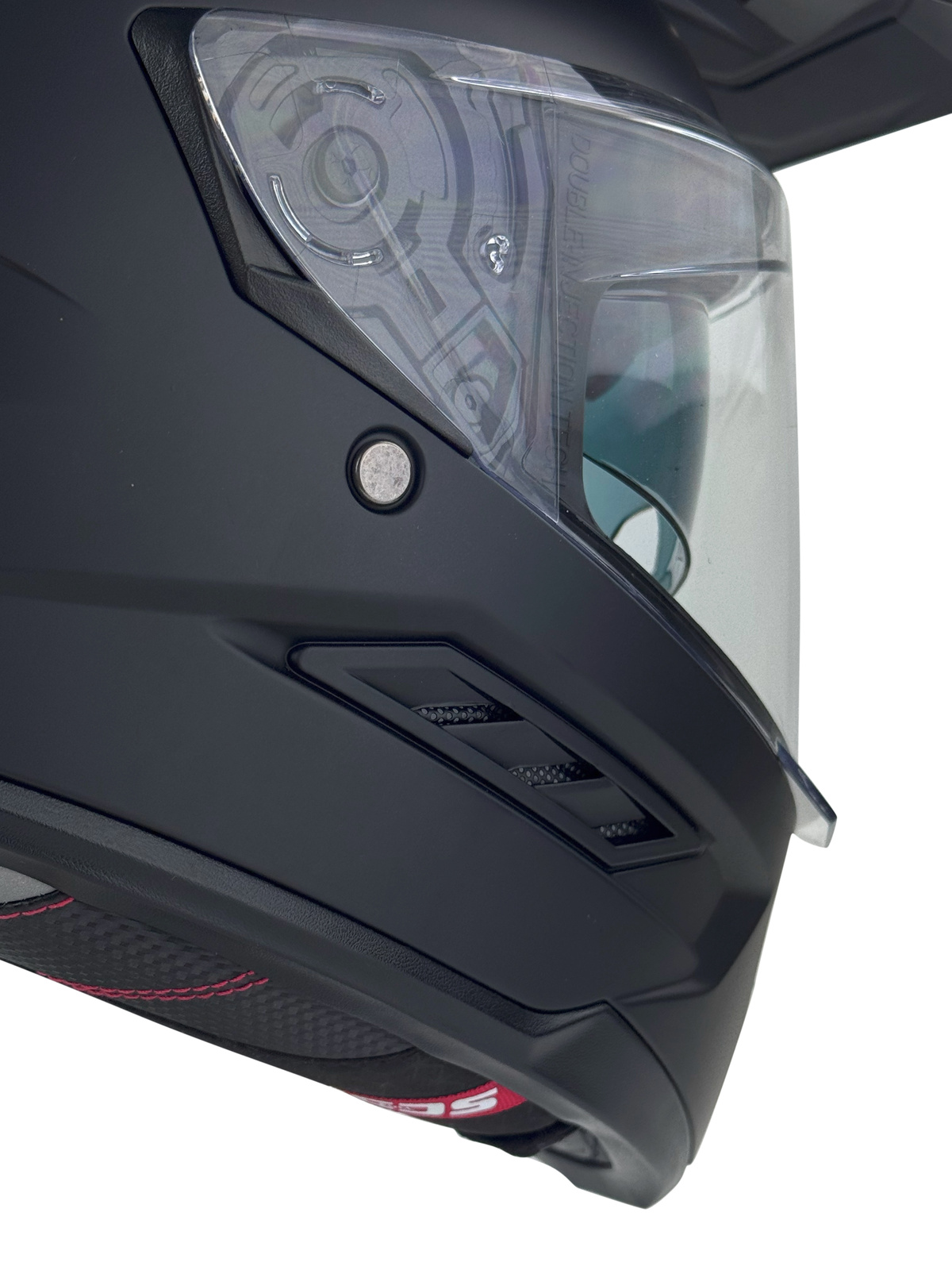 Osłona podbródka – zwiększa ochronę i komfort, redukuje podmuchy powietrza oraz wnikanie pyłu do wnętrza kasku.