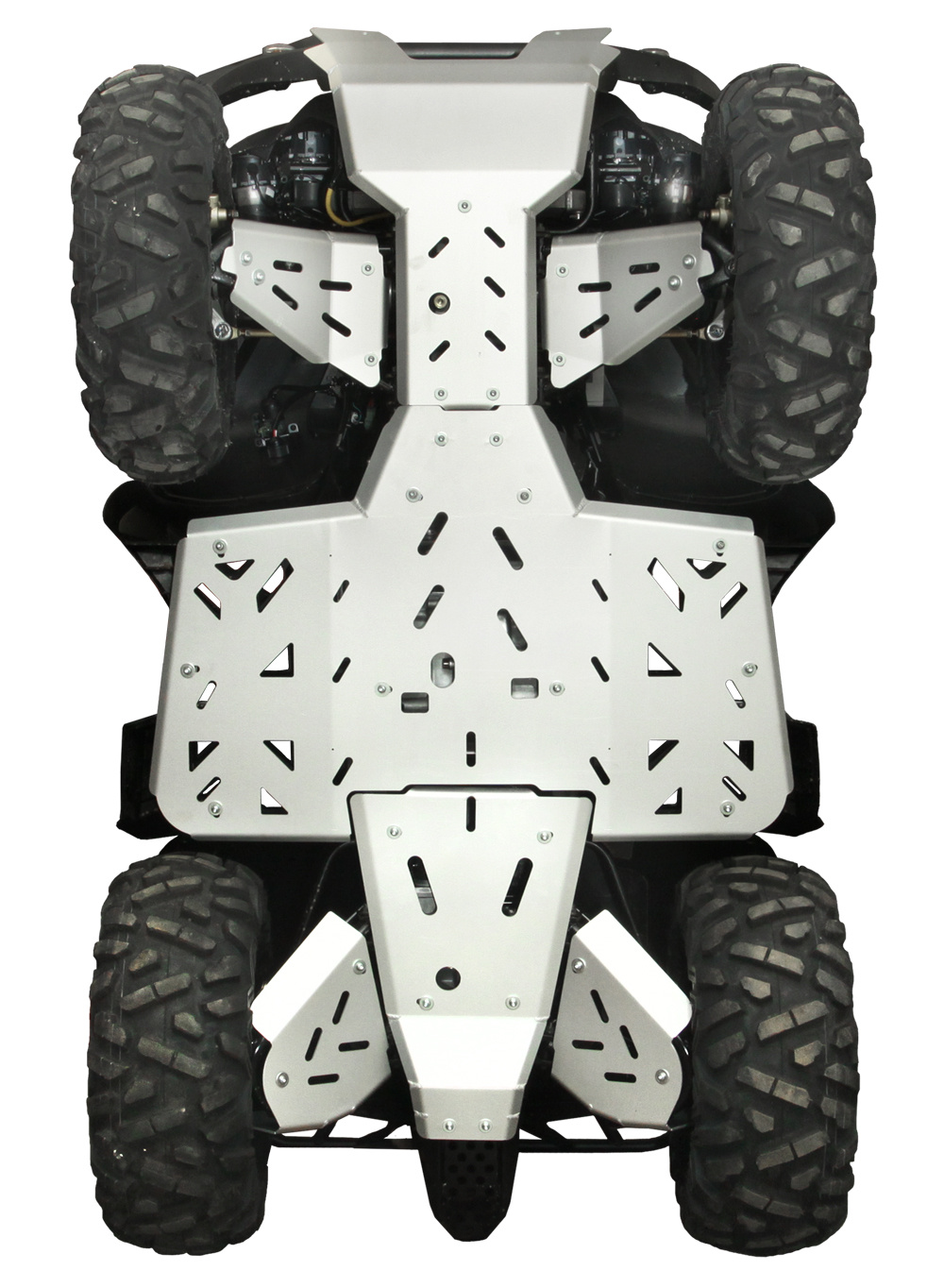 Aluminiowy zestaw płyt podwozia Shark to najlepsze rozwiązanie, aby w pełni ochronić podwozie quada przed uszkodzeniami mechanicznymi. Płyty wykonane są z lekkiego i wytrzymałego aluminium, dzięki czemu chronią pojazd przed kamieniami i wystającymi głazami, dodatkowo osłony wahaczy zasłaniają obudowę silnika przed uderzeniami. Płyty posiadają wygodne nacięcia, tak aby bez demontażu można było przeprowadzić serwis pojazdu.